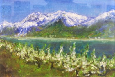 雄大な山とリンゴの木の組み合わせが